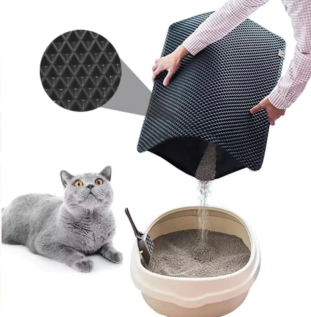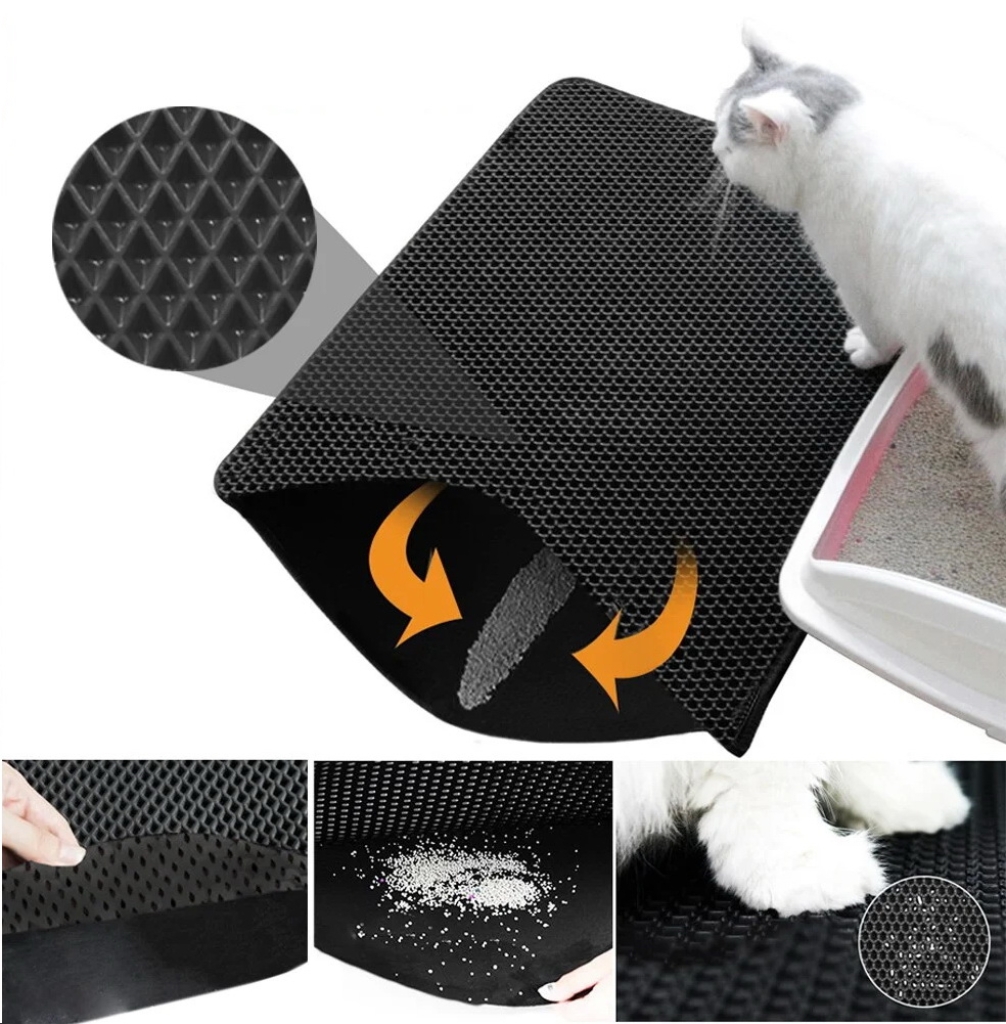 Килимок складається з двох шарів, верхній шар виглядає у вигляді сітки, а нижній шар цільний та водонепронекний. Завдяки чому часточки наповнювачу, бруду або їжі просипаються через верхній шар і залишаються на нижньому.