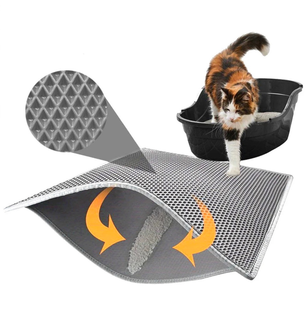 Килимок складається з двох шарів, верхній шар виглядає у вигляді сітки, а нижній шар цільний та водонепронекний. Завдяки чому часточки наповнювачу, бруду або їжі просипаються через верхній шар і залишаються на нижньому.