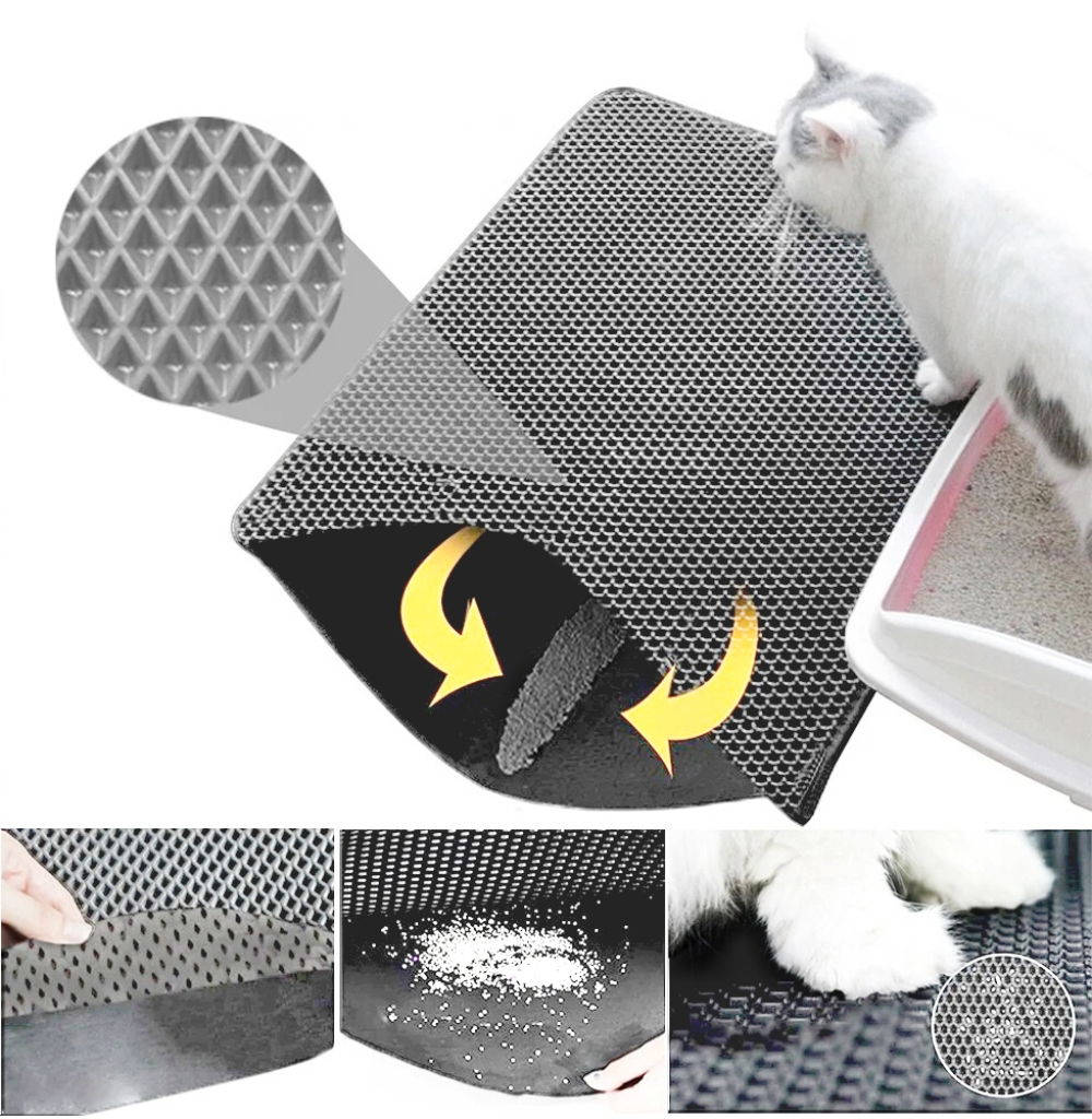 Килимок складається з двох шарів, верхній шар виглядає у вигляді сітки, а нижній шар цільний та водонепронекний. Завдяки чому часточки наповнювачу, бруду або їжі просипаються через верхній шар і залишаються на нижньому.