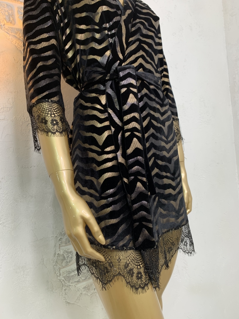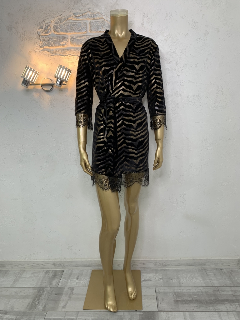 Жіночий велюровий халат. Чорний колір. Принт Золото.