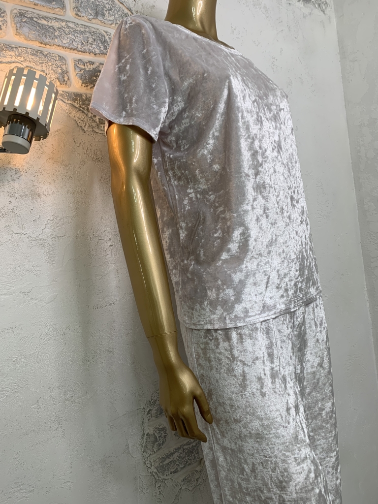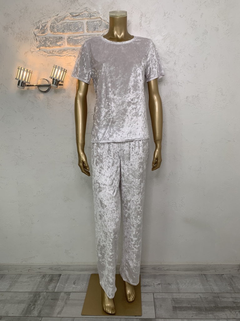 Жіночий велюровий піжамний комплект. Футболка та штани. Білий колір.