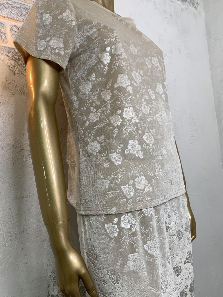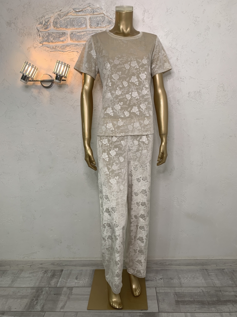 Жіночий велюровий піжамний комплект. Футболка та штани. Молочний колір. Принт Квіти.