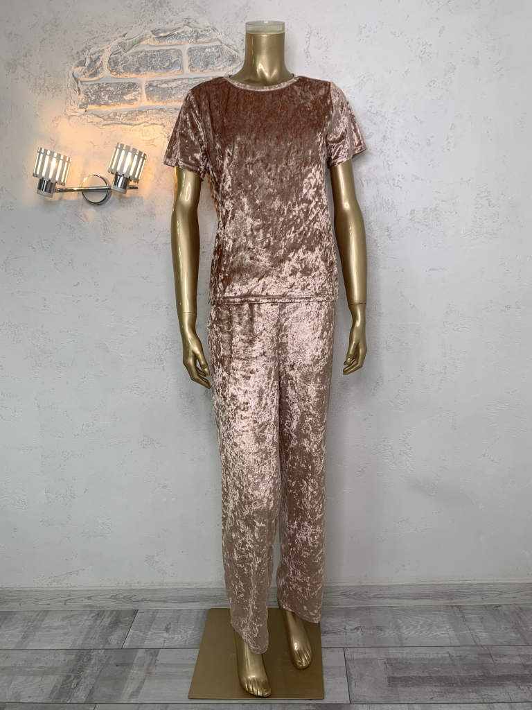 Жіночий велюровий піжамний комплект. Футболка та штани. Шоколадно-пудровий колір.