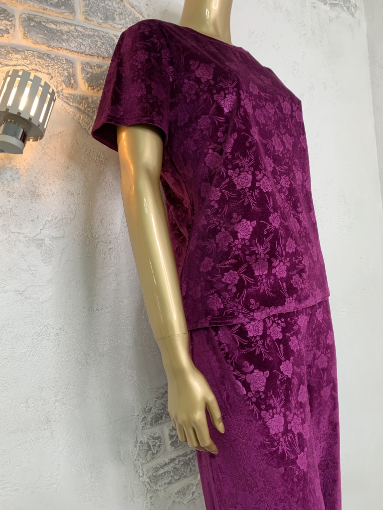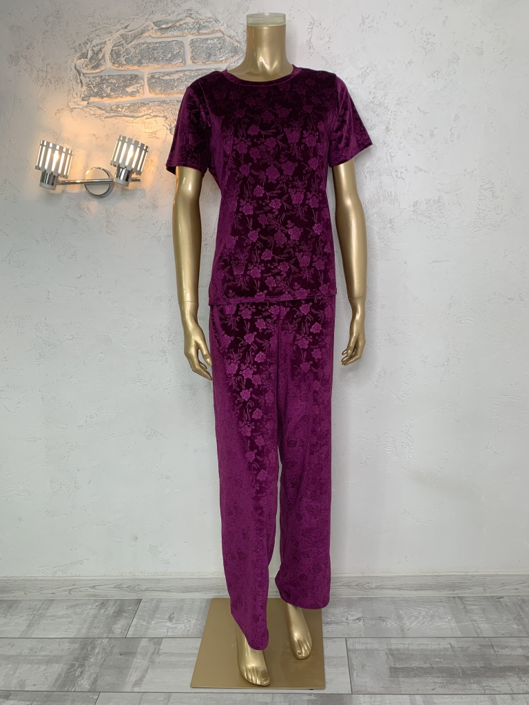 Жіночий велюровий піжамний комплект. Футболка та штани. Бузковий колір. Принт Квіти.