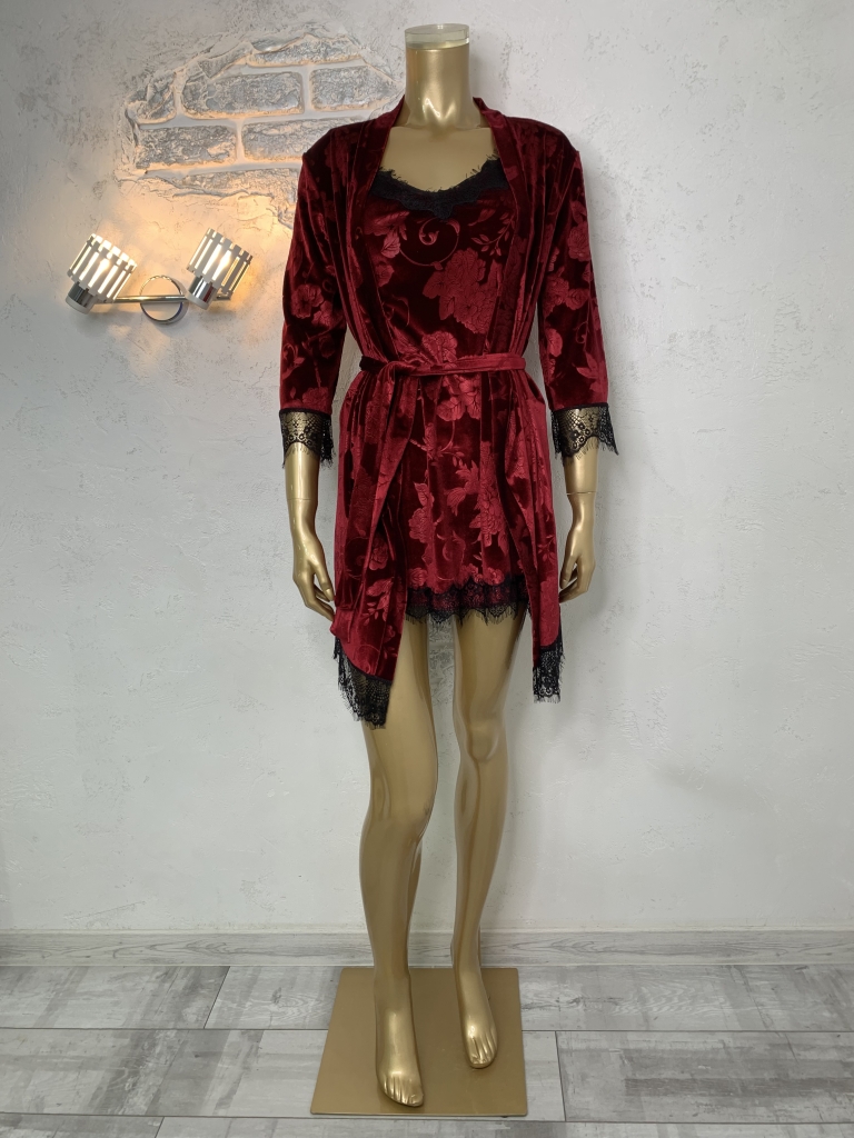 Жіночий велюровий піжамний комплект. Халат та нічна сорочка. Бордовий колір. Принт Квіти.