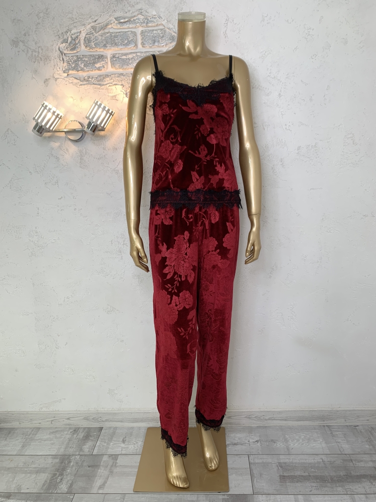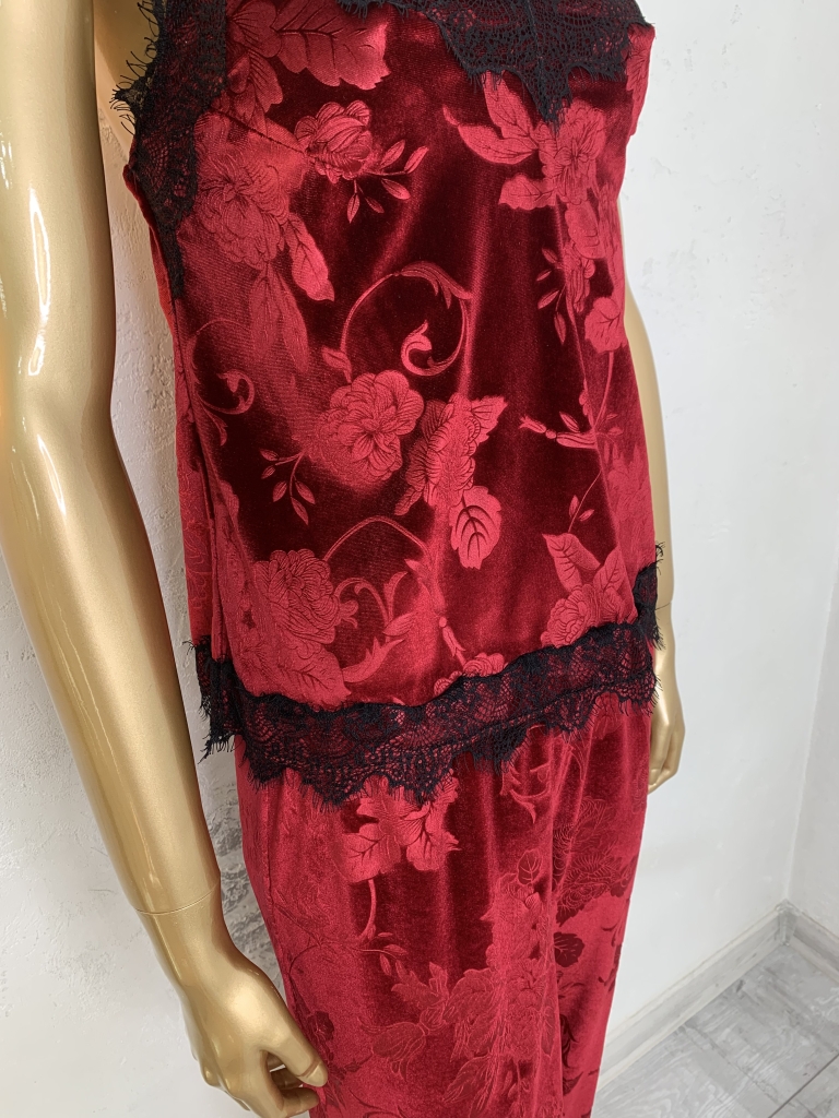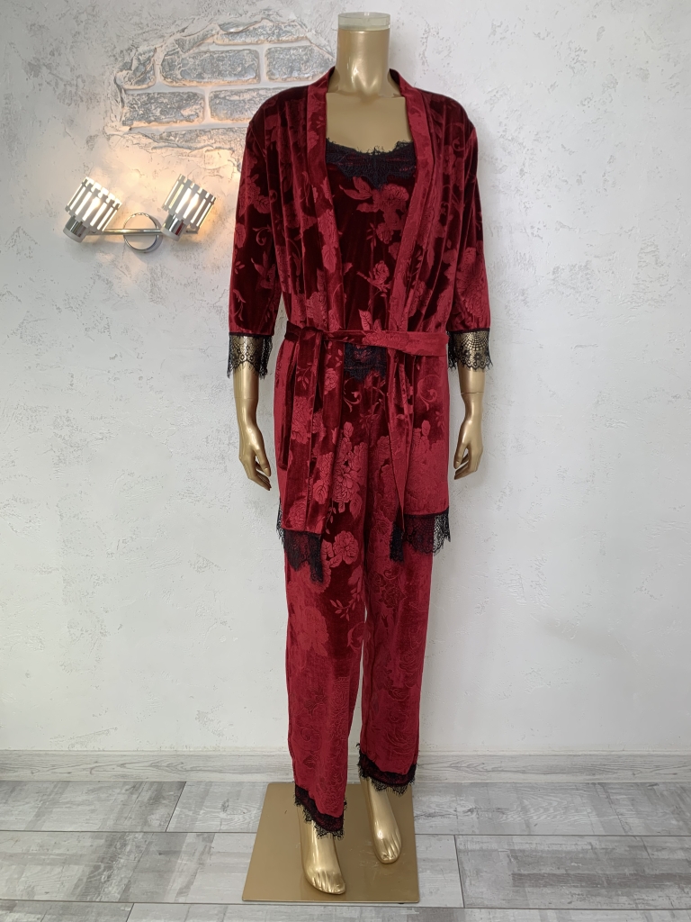 Жіночий велюровий піжамний комплект. Халат, майка та штани. Бордовий колір. Принт Квіти.