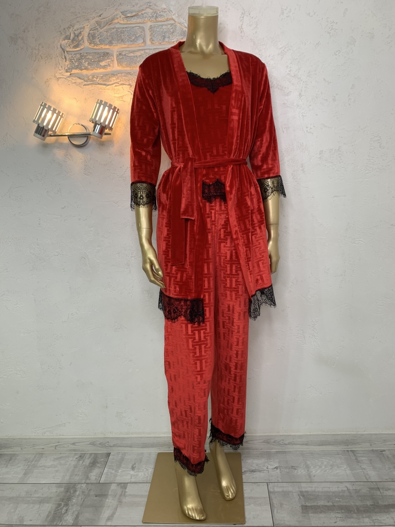 Жіночий велюровий піжамний комплект. Халат, майка та штани. Червоний колір. Принт Фенді.