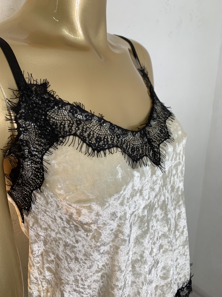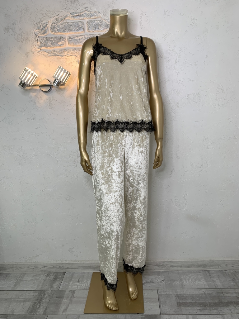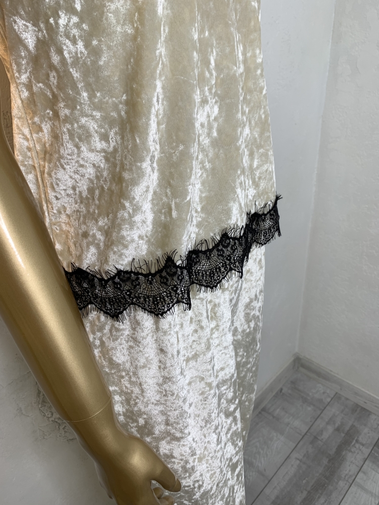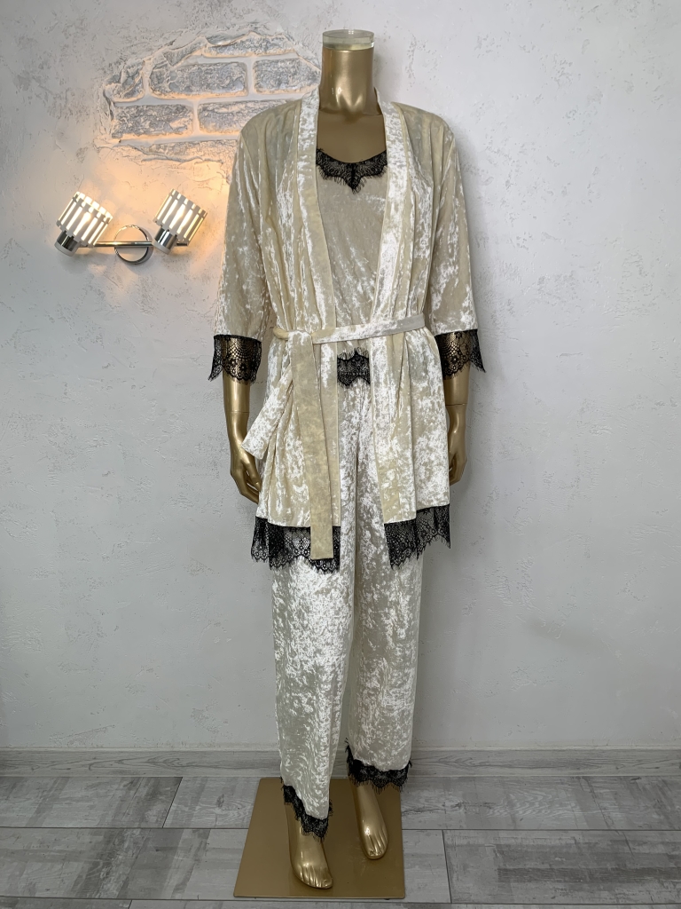 Жіночий велюровий піжамний комплект. Халат, майка та штани. Молочний колір.
