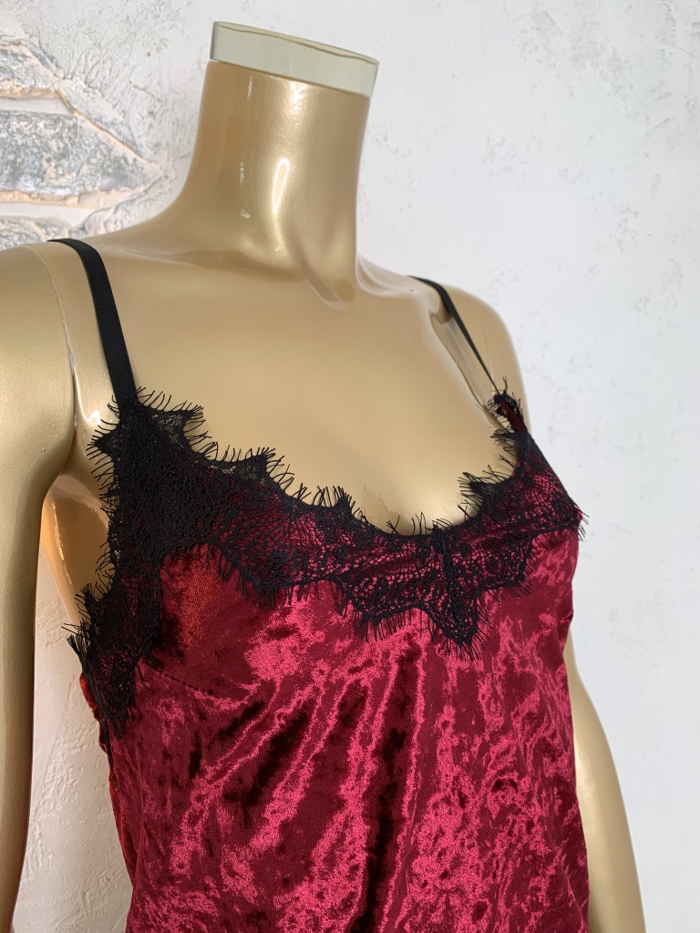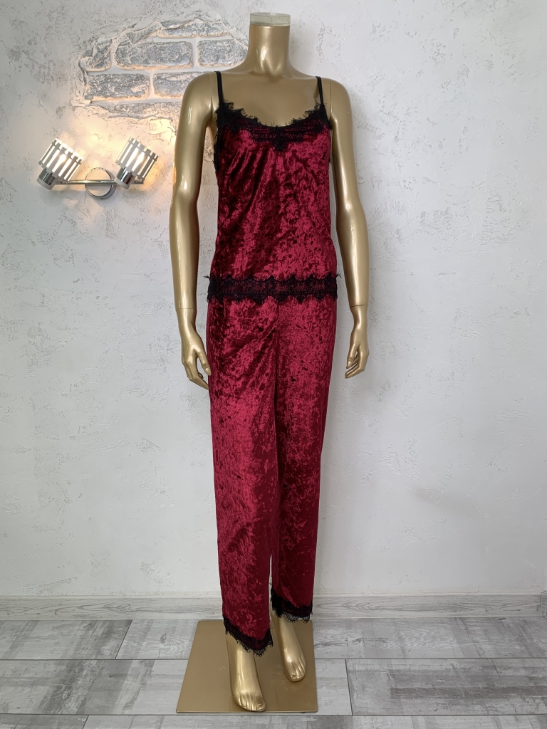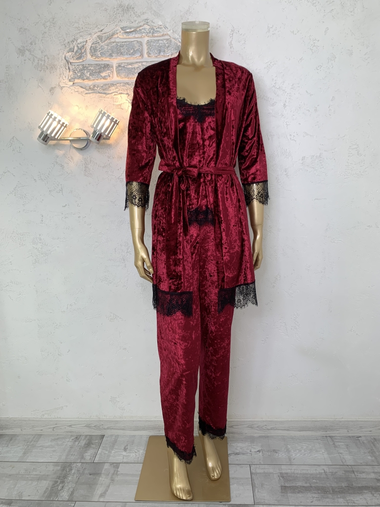 Жіночий велюровий піжамний комплект. Халат, майка та штани. Вишневий колір.