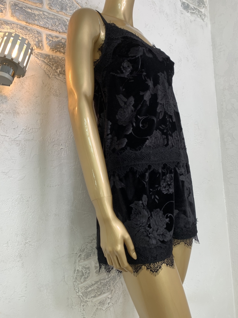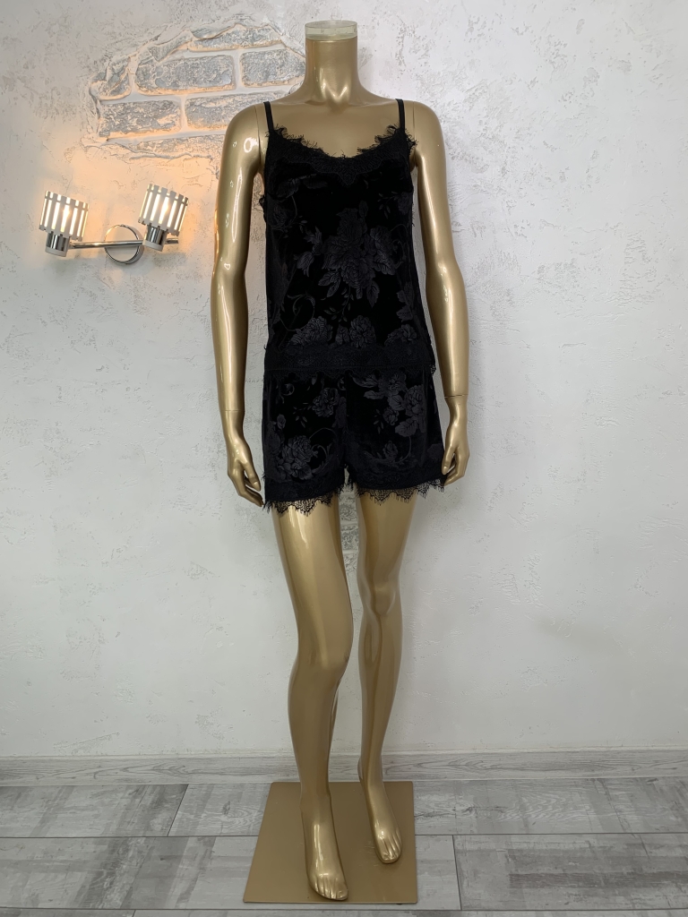 Жіночий велюровий піжамний комплект. Майка та шорти. Чорний колір. Принт Квіти.