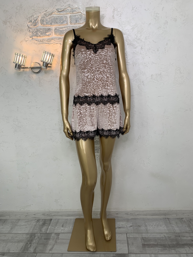 Жіночий велюровий піжамний комплект. Майка та шорти. Пудровий колір. Принт абстракції.